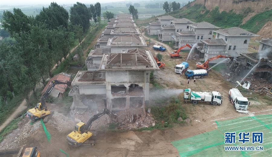 大型機械對西安市鄠邑區(qū)蔣村鎮(zhèn)的違建別墅進行拆除(2018年8月14日無人機拍攝)。 新華社記者 邵瑞 攝