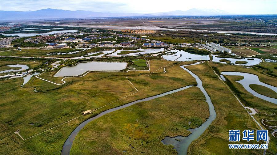 這是甘肅省張掖國家濕地公園一角(2018年9月5日無人機拍攝)。 新華社記者 陶明 攝