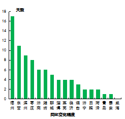 煙臺和威海市未出現(xiàn)重污染天氣;重污染天數(shù)最多的是聊城和菏澤市,為21天。16市同比減少,減少天數(shù)最多的是德州市,為17天;威海市同比持平。