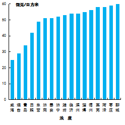 可吸入顆粒物濃度最好的是威海市,為50μg/m3,最差的是聊城市,為120μg/m3。17市均同比下降,下降幅度最大的是濟南市,為13.7%。