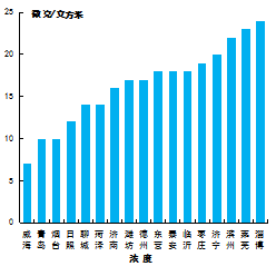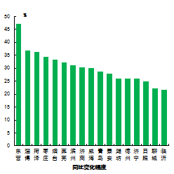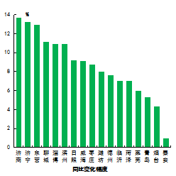 二氧化硫濃度最好的是威海市,為7μg/m3,最差的是淄博市,為24μg/m3。17市均同比下降,下降幅度最大的是東營市,為47.1%。