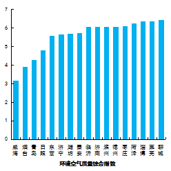 環(huán)境空氣質(zhì)量綜合指數(shù)最好的是威海市,為3.17,最差的是聊城市,為6.43。17市均同比下降,下降幅度最大的是東營市,為13.5%。