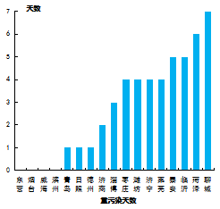 東營(yíng)等4市未出現(xiàn)重污染天氣;重污染天數(shù)最多的是聊城市,為7天。6市同比減少,減少天數(shù)最多的是濱州市,為4天;3市同比持平;8市同比增加,增加天數(shù)最多的是聊城市,為3天。