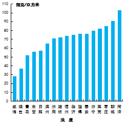 可吸入顆粒物濃度最好的是威海市,為57μg/m3,最差的是菏澤市,為179μg/m3。16市同比下降,下降幅度最大的是東營(yíng)市,為17.2%;泰安市同比上升,上升幅度為5.3%。
