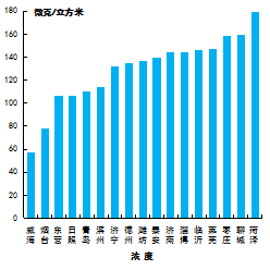 細(xì)顆粒物濃度排名前20位(第1位至第20位)的縣(市、區(qū))依次為:文登市,榮成市,長(zhǎng)島縣,威海市環(huán)翠區(qū),威海市臨港經(jīng)濟(jì)技術(shù)開(kāi)發(fā)區(qū)、威海市火炬高新技術(shù)產(chǎn)業(yè)開(kāi)發(fā)區(qū)(并列第5位),威海市威海經(jīng)濟(jì)技術(shù)開(kāi)發(fā)區(qū),乳山市,煙臺(tái)市開(kāi)發(fā)區(qū),蓬萊市,煙臺(tái)市芝罘區(qū)、煙臺(tái)市牟平區(qū)(并列第11位),煙臺(tái)市福山區(qū)、海陽(yáng)市(并列第13位),青島市市南區(qū)、煙臺(tái)市高新區(qū)(并列第15位),煙臺(tái)市萊山區(qū)、招遠(yuǎn)市(并列第17位),青島市嶗山區(qū)、萊州市(并列第19位)。