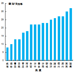 綜合指數(shù)最好的縣(市、區(qū))是威海市威海經(jīng)濟(jì)技術(shù)開(kāi)發(fā)區(qū),為2.88;最差的縣(市、區(qū))是莘縣,為9.10。