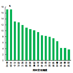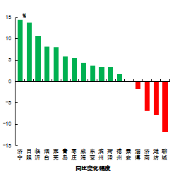 二氧化硫濃度最好的是威海市,為8μg/m3,最差的是淄博市,為32μg/m3。15市同比下降,下降幅度最大的是棗莊市,為56.4%;聊城市同比持平;德州市同比上升,上升幅度為8.0%。