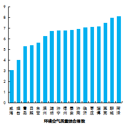 環(huán)境空氣質(zhì)量綜合指數(shù)最好的是威海市,為3.08,最差的是菏澤市,為8.12。17市均同比下降,下降幅度最大的是棗莊和東營(yíng)市,為17.2%。