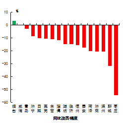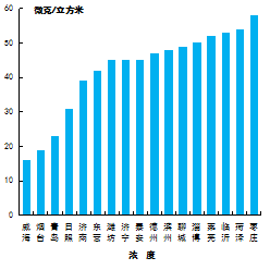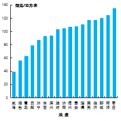 可吸入顆粒物濃度最好的城市是威海市,為39μg/m3;最差的城市是棗莊市,為135μg/m3。4市同比下降,下降幅度最大的城市是東營市,為9.7%;13市同比上升,上升幅度最大的城市是泰安市,為22.7%。