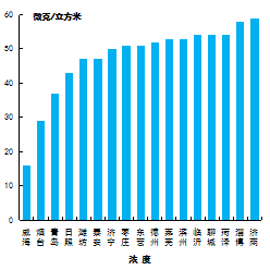 二氧化氮濃度最好的城市是威海市,為16μg/m3;最差的城市是濟南市,為59μg/m3。煙臺市同比下降,下降幅度為3.3%;威海市同比持平;15市同比上升,上升幅度最大的城市是棗莊市,為54.5%。