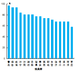 綜合指數(shù)最好的縣(市、區(qū))是威海市環(huán)翠區(qū)和威海市臨港經(jīng)濟技術開發(fā)區(qū),為2.53;最差的縣(市、區(qū))是棗莊市市中區(qū),為7.36。