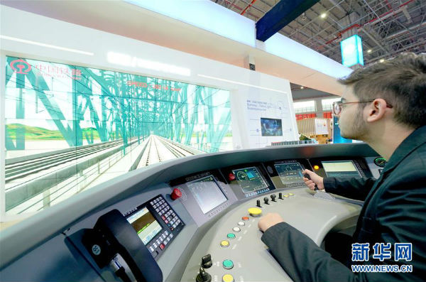 在中國國際進(jìn)口博覽會(huì)的國家貿(mào)易投資綜合展(國家展)上,一名格魯吉亞政府代表團(tuán)成員在中國館內(nèi)體驗(yàn)駕駛高鐵(11月5日攝)。新華社記者 陳建力 攝
