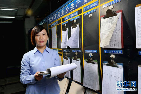 胡小燕在曾經(jīng)工作過的陶瓷廠檢查職工權(quán)益保護(hù)工作(2013年11月5日攝)。2008年1月,在廣東佛山一家陶瓷建材企業(yè)打工的胡小燕在有3000多萬農(nóng)民工的廣東省高票當(dāng)選,成為首位農(nóng)民工全國人大代表。 新華社記者 劉大偉 攝