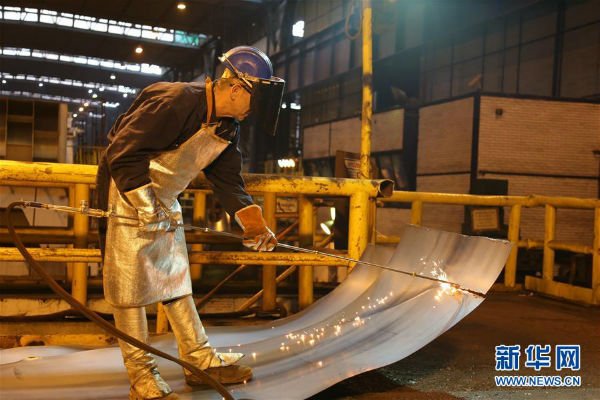 在塞爾維亞河鋼(塞爾維亞)鋼鐵有限公司的廠區(qū)內(nèi),一名工人在切割鋼板(2017年2月21日攝)。 新華社記者 王慧娟 攝