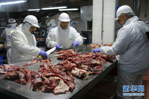 在阿根廷休斯,牛肉加工廠工人在分割牛肉(6月12日攝)。這家工廠是中國企業(yè)新大洲的戰(zhàn)略合作伙伴,每天屠宰500至700頭牛,牛肉主要出口到中國。 新華社記者 倪瑞捷 攝