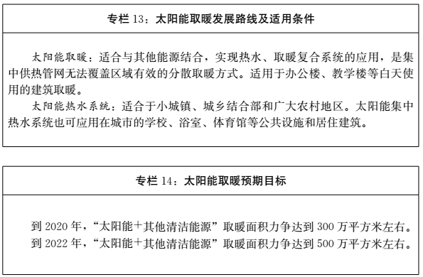 大力推廣太陽能區(qū)域取暖。積極推進太陽能與電能、天然氣、空氣源(地源)熱泵、天然氣熱電聯(lián)產(chǎn)等能源相結(jié)合,采用集中與分布相結(jié)合、多能互補的取暖模式,在條件適宜的小城鎮(zhèn)、民用及公共建筑上推廣太陽能取暖系統(tǒng)。在農(nóng)業(yè)大棚、養(yǎng)殖場等用熱需求大且與太陽能特性匹配的行業(yè),充分利用太陽能供熱。