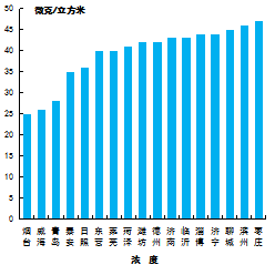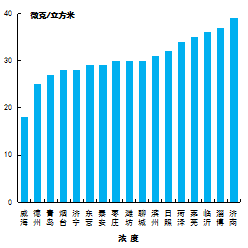 細(xì)顆粒物濃度最好的是煙臺(tái)市,為25μg/m3,最差的是棗莊市,為47μg/m3。15市同比下降,下降幅度最大的是泰安市,為18.6%;青島市同比持平;威海市同比上升,上升幅度為8.3%。
