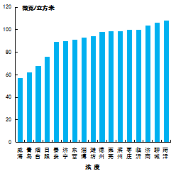 可吸入顆粒物濃度最好的是威海市,為57μg/m3,最差的是菏澤市,為108μg/m3。16市同比下降,下降幅度最大的是德州市,為19.7%;威海市同比持平。