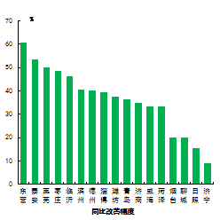 二氧化硫濃度最好的是威海市,為6μg/m3,最差的是淄博和濟(jì)寧市,為20μg/m3。17市均同比下降,下降幅度最大的是東營(yíng)市,為60.5%。